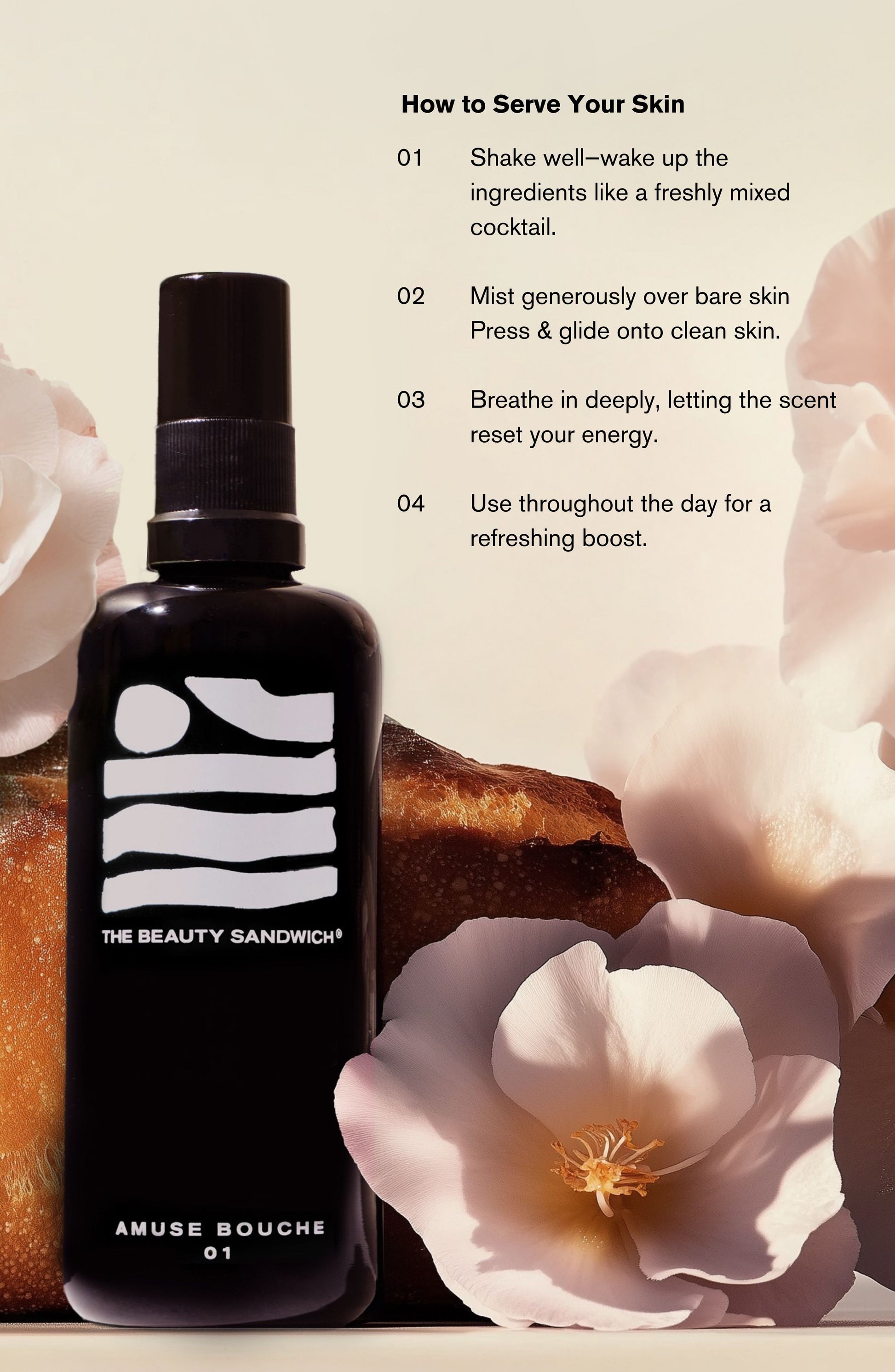 Mist Amuse Bouche on clean, dry or damp skin before applying other skincare.